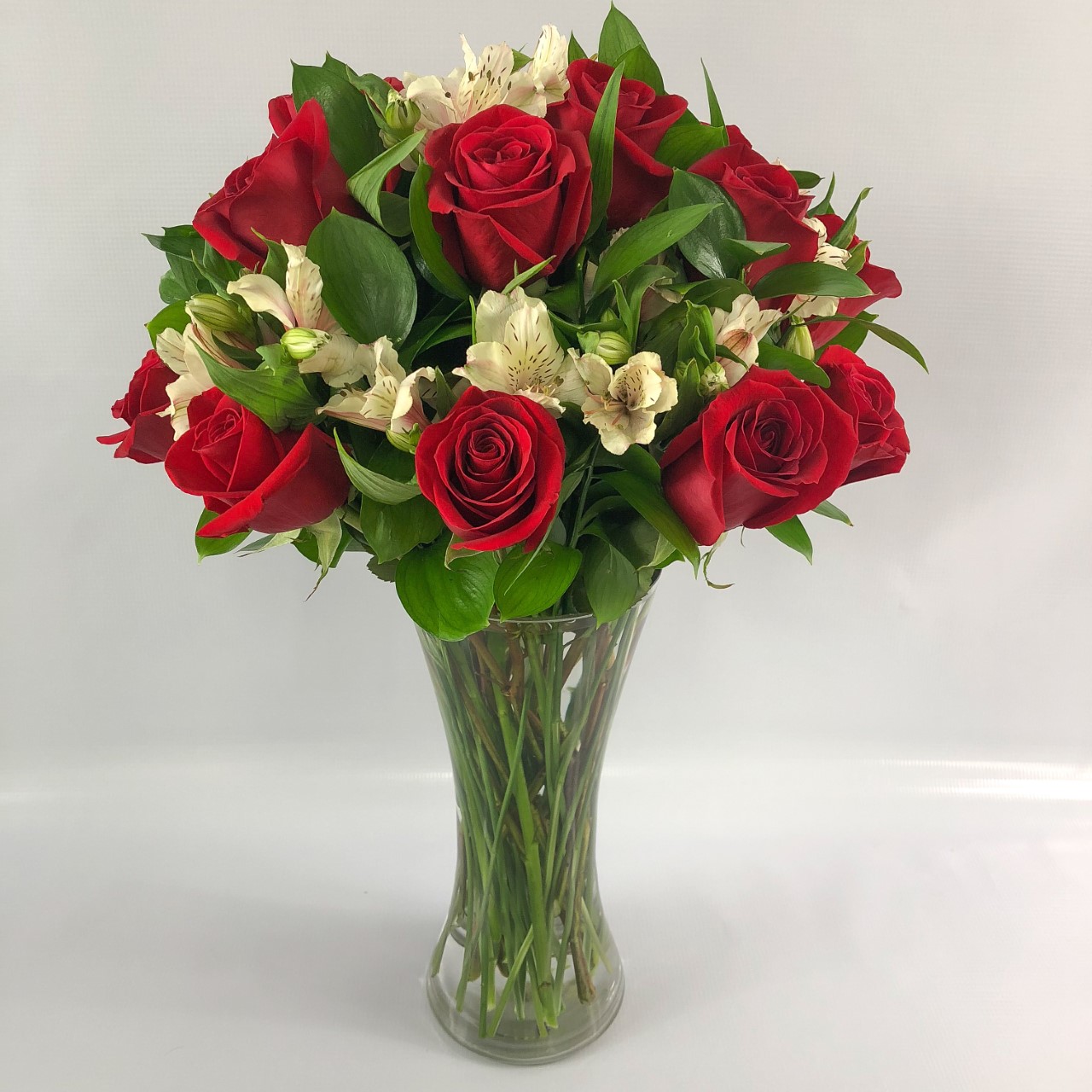 #359 Clásico diseño con 1 docena de Rosas, Alstroemeria y Follaje de temporada en base de cristal transparente.