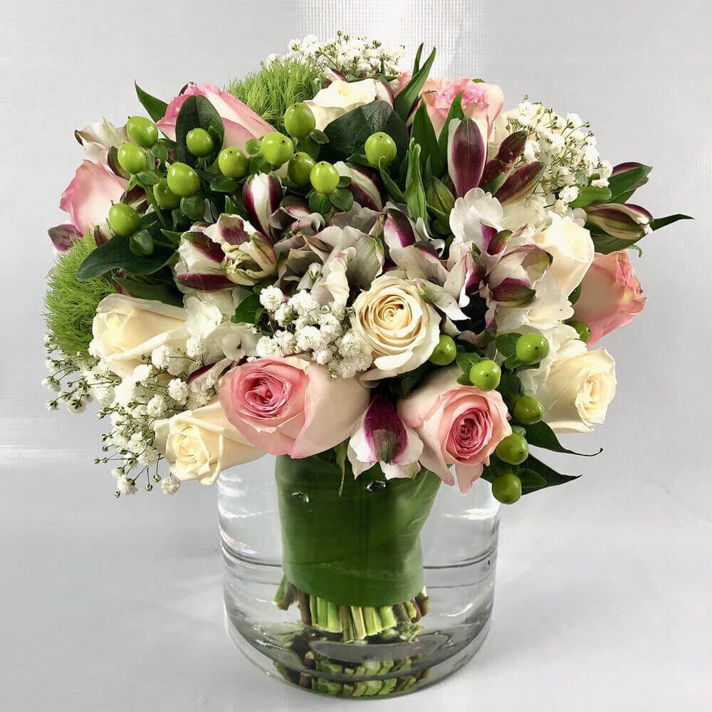 #10 Delicado bouquet estilo pucha preparado con 2 docenas de Rosas, Alstroemeria, Hypericum y Gypsophilla en base de cristal redonda transparente.