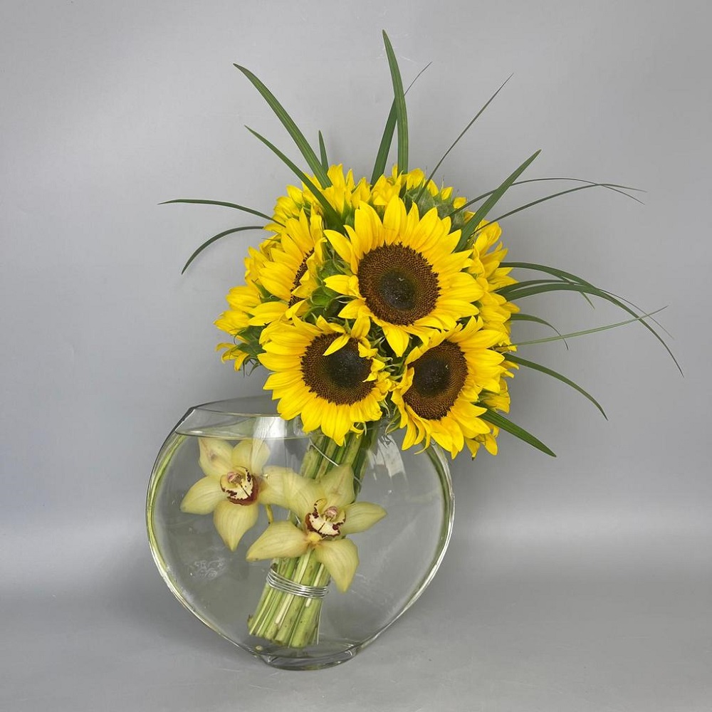 # 217 Espectacular diseño que combina una pucha de girasoles y 2 delicadas flores de orquídea cymbidium sumergidas en agua en una base de cristal de estilo contemporáneo