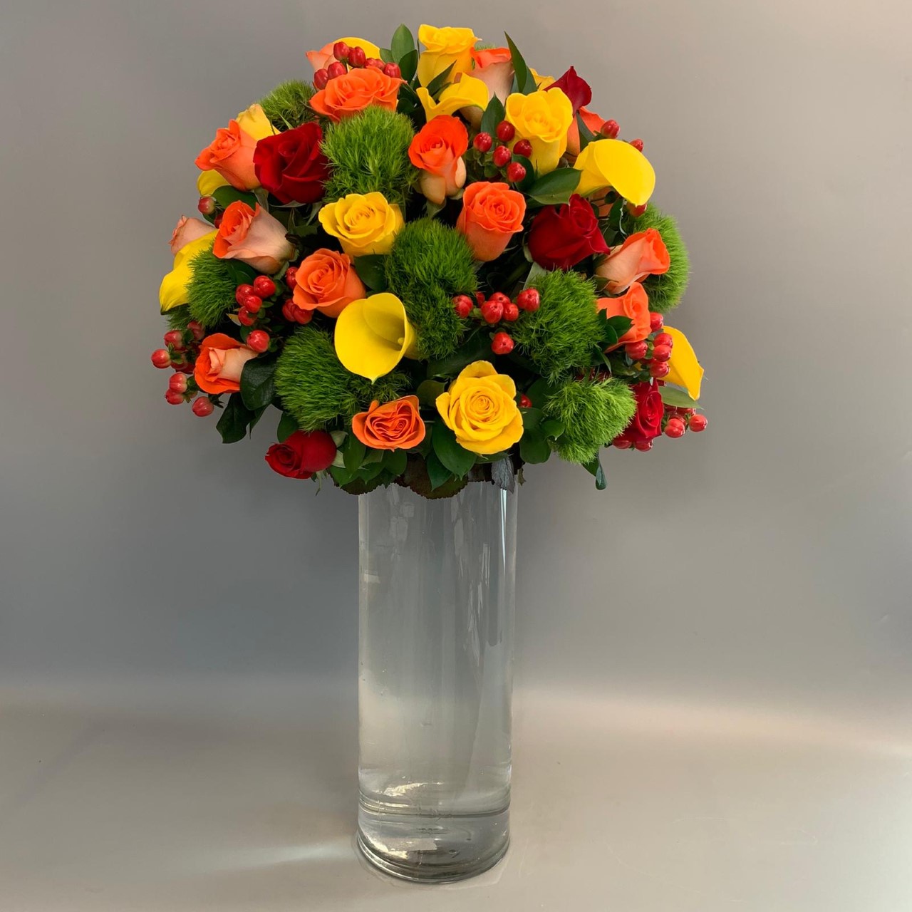 #507 Impactante diseño con 4 docenas de Rosas, Calla mini, Hypericum, Dianthus y Follaje de temporada en base cilíndrica transparente.