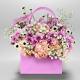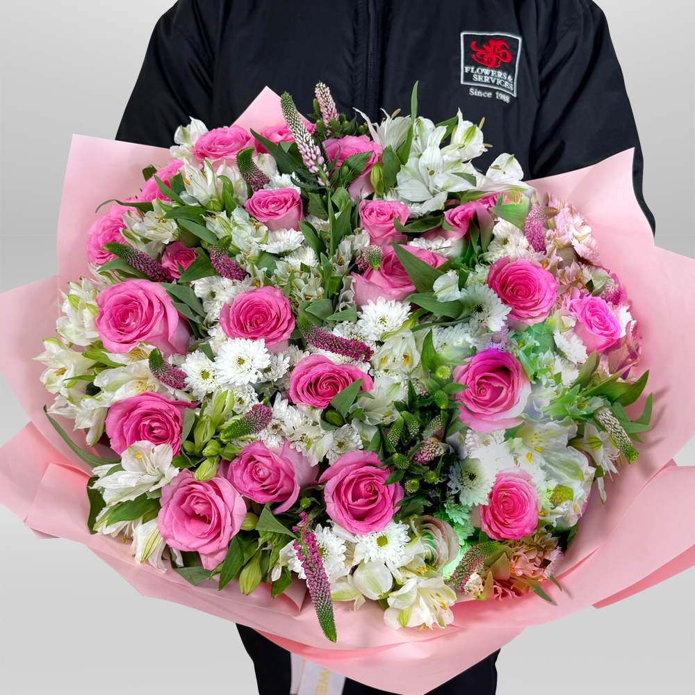 #128 Vibrante bouquet elaborado rosas hot pink, astromelias y verónicas, envuelto en delicado papel coreano rosado. Un diseño lleno de color, frescura y estilo primaveral, ideal para sorprender con un toque moderno y femenino.