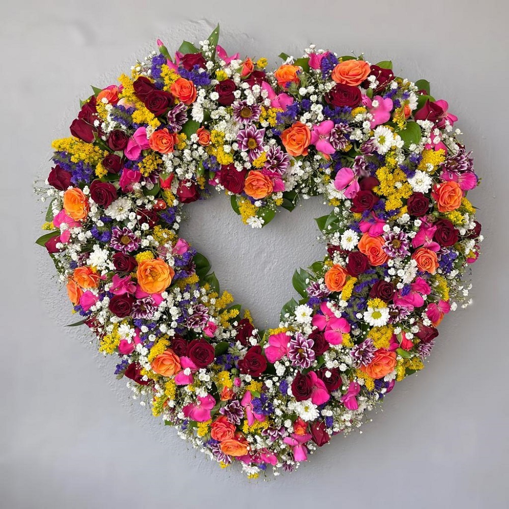 #256 Corazón elaborado con Rosa mini, Margarita mini, Gypsophila, Solidaster, Statice, Rafinne y Follaje de temporada.
