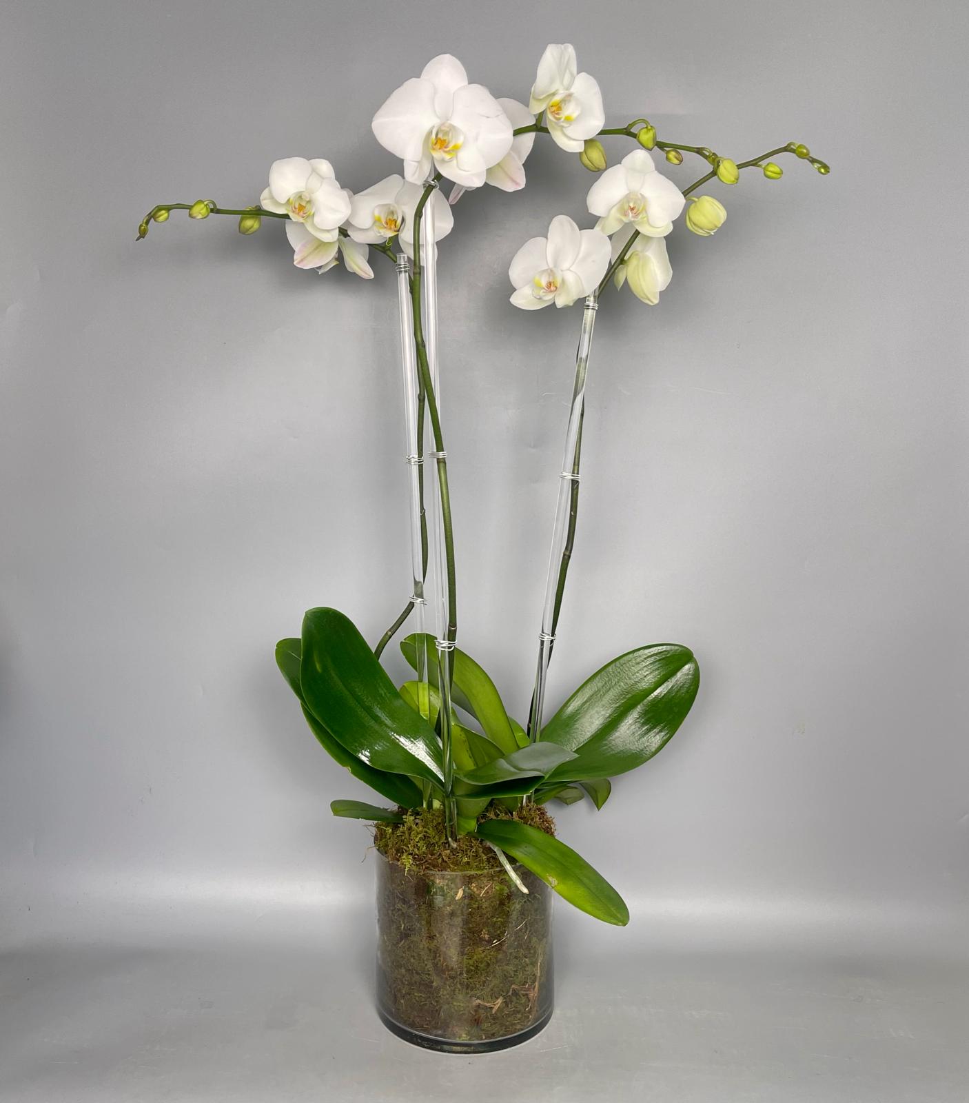 #220 Show con plantas de orquídea Phalaenopsis en un diseño natural y sereno en base de cristal transparente.