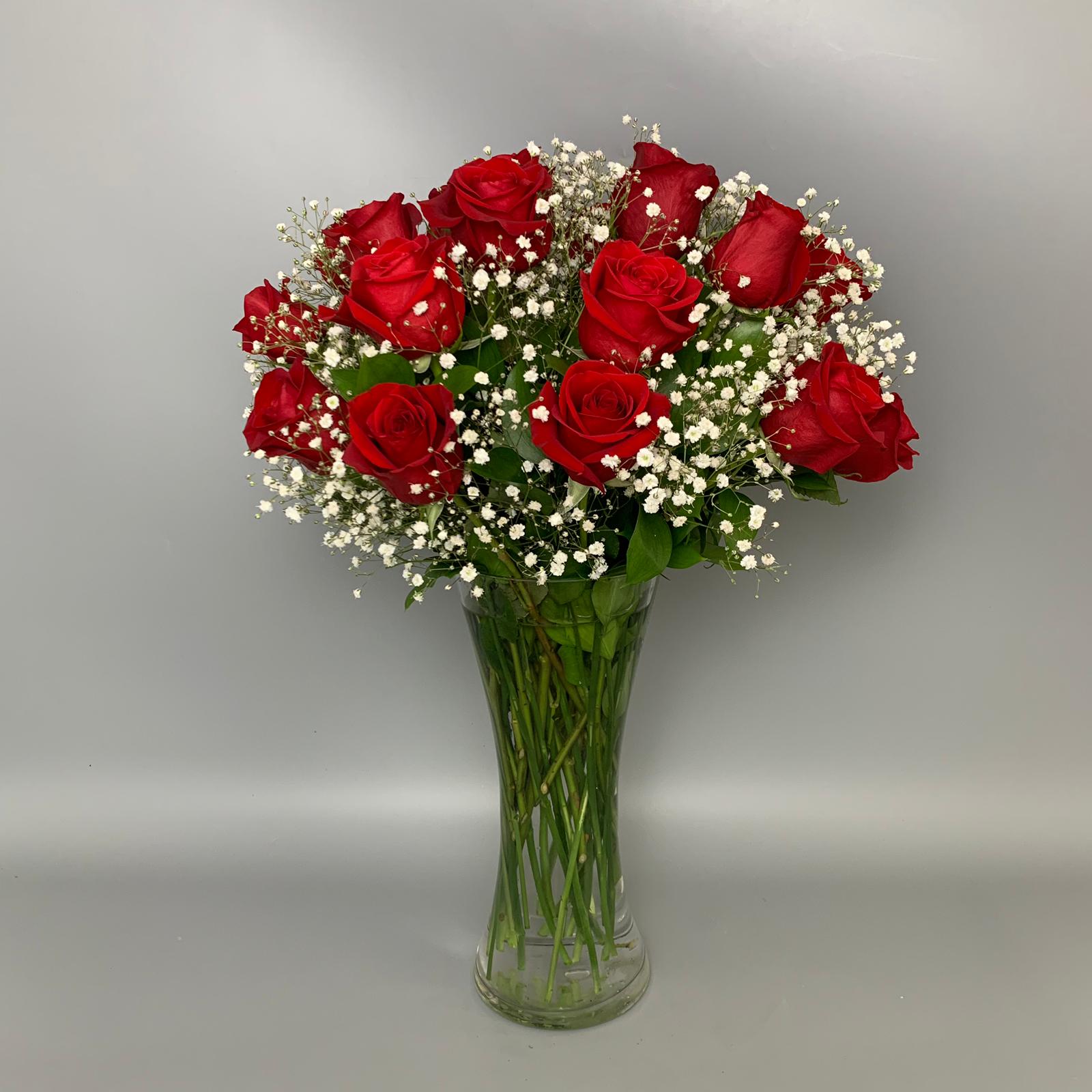 #361 Diseño preparado con 2 docenas de Rosas, Gypsophilla y Follaje de temporada en base de cristal.