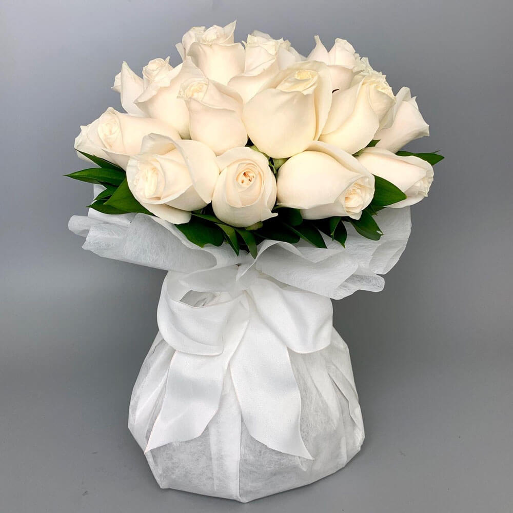 #100 Elegante bouquet preparado con 2 docenas de Rosas y Follaje de temporada, decorado con Filo Paper y lazo.