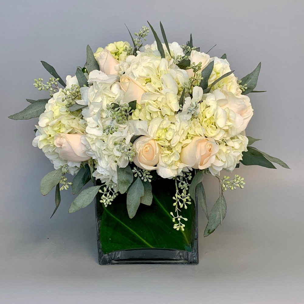 #33 Diseño en tonos suaves con una docena de Rosas, Hortensia y Eucalipto Seeded en base de cristal.