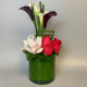#98 Diseño contemporáneo con pucha en Calla mini, flores de Cymbidium verde sumergidas en base rectangular transparente.