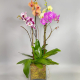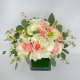 #141 Diseño de estilo contemporáneo con Rosas, Orquídea Phalaenopsis, Hortencia antique y blanca, Estrellas de Belen y Ruscus italiano en base de cristal.