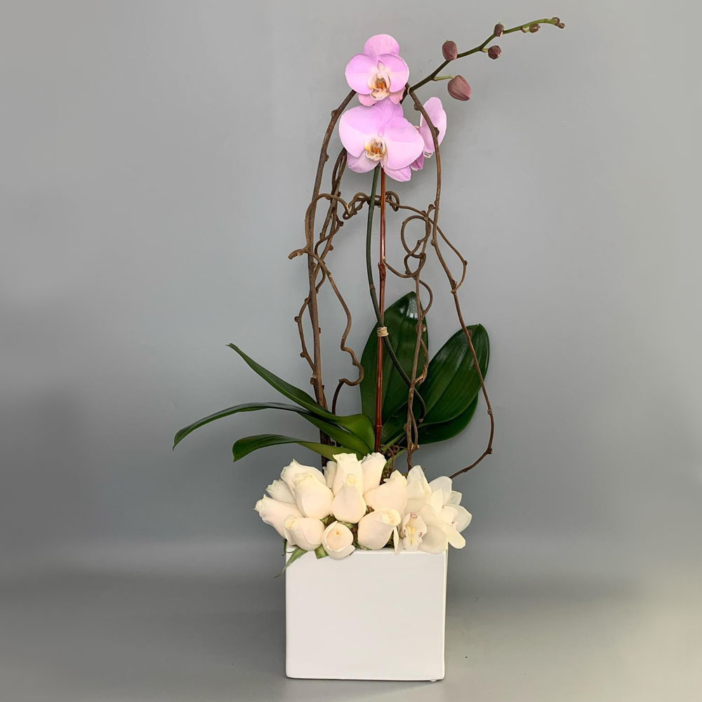 Delicado y romántico diseño en planta de orquídeas Phalaenopsis rosada con delicado arreglo de rosas y flores de cymbidium en base de cerámica cuadrada. Feminidad, gracia y alegría son algunos de los significados de regalar orquídeas rosadas, el blanco de las rosas simboliza el amor puro y la felicidad. Un duo perfecto a la hora de expresar tus sentimientos más sinceros !!!