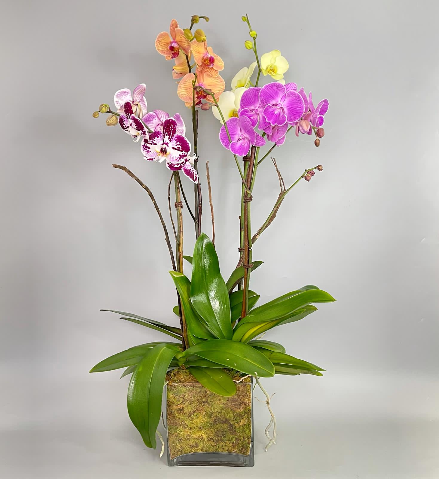 Jardin de orquídeas phalaenopsis en base de cristal con musgo.