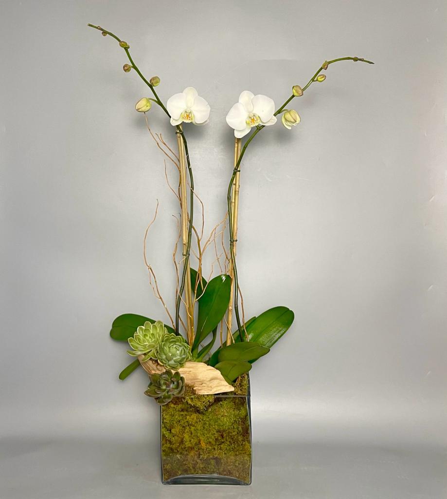 #135 Hermosa combinación de dos plantas de Phalaenopsis, con plantas de suculentas, Curly Willow, Bamboo y musgo en base de cristal cuadrada.