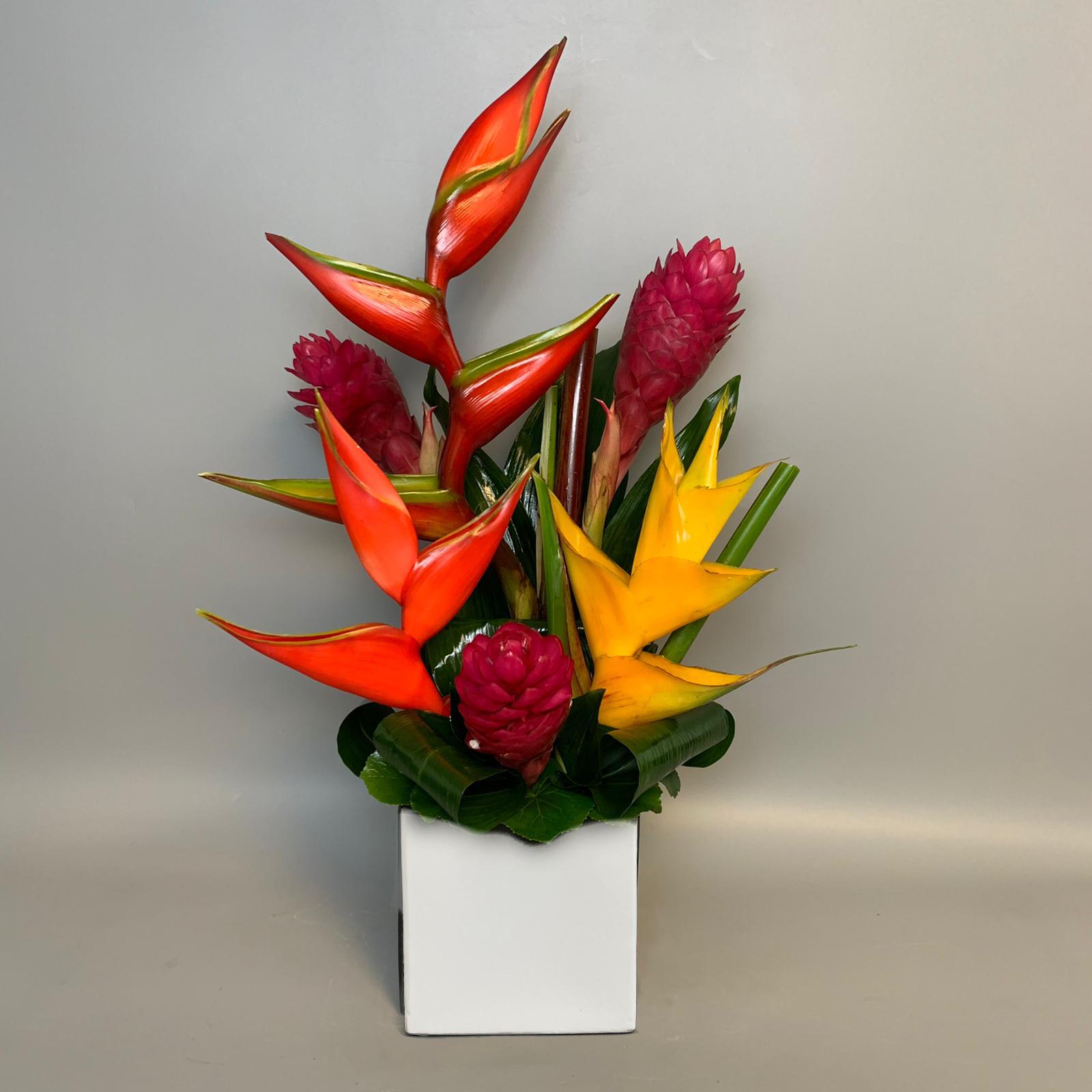#25 Sobrio y elegante diseño tropical preparado con Ginger, Heliconias y follaje de temporada en base de cerámica.