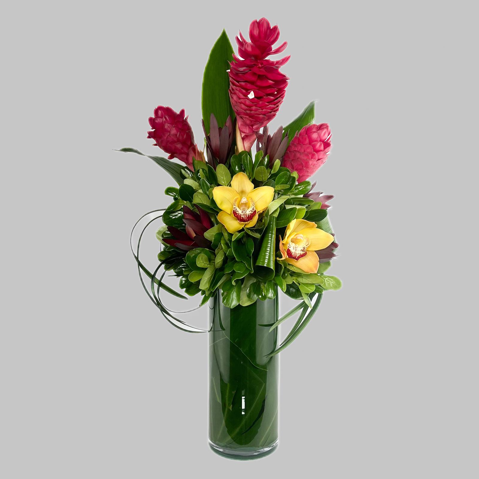 #80 Arreglo tropical con Ginger, Pincushion y Follaje de temporada en base de cristal.