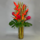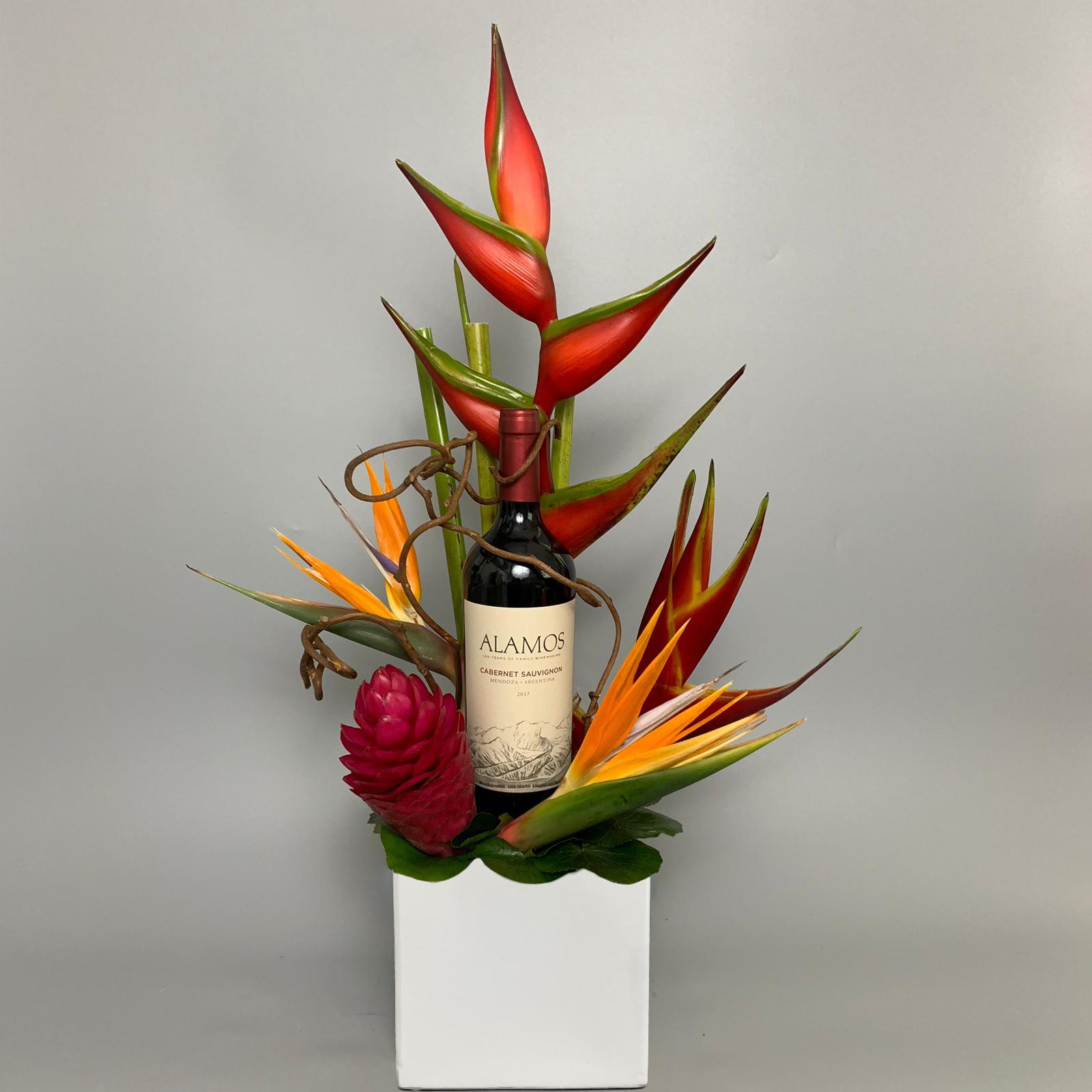 #145 Diseño preparado con Heliconias, Aves del Paraíso y Ginger con botella de vino en base de cerámica.