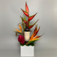 #111 Colorido diseño con Heliconias, Ginger, Aves del Paraíso y Curly Willow en base cilíndrica transparente.