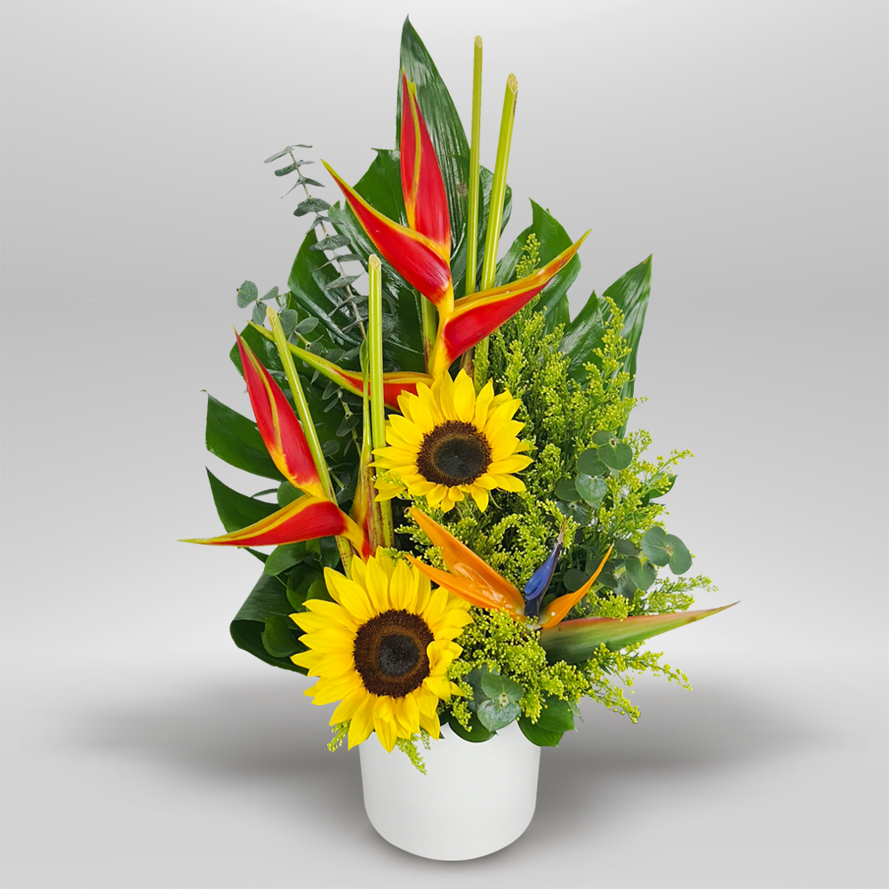 #240 Vibrante diseño de estilo tropical elaborado con girasoles, heliconias y ave de paraíso todo esto realzado con toques de solidaster que le dan brillo a la composición y follajes de temporada que aportan frescura y movimiento. Presentado en una base de cerámica blanca.