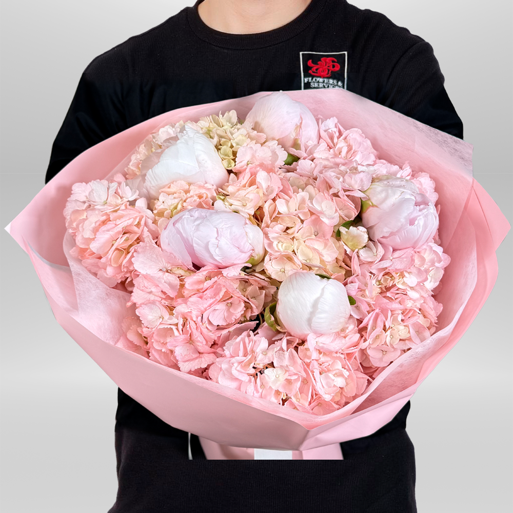 #134 Un delicado buchón de flores de temporada que combina peonías y hortensias en tonos rosados, envuelto con cinta y papel cuidadosamente seleccionados. Este diseño celebra la elegancia y el encanto natural de la temporada, ideal para regalar en cualquier ocasión especial y sorprender con la magia de las peonías.