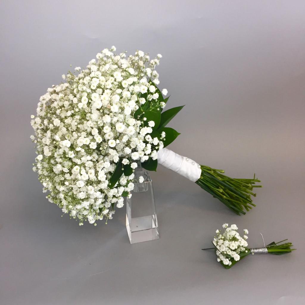 #573 Elegancia y sencillez son las dos palabras que mejor describen este Bouquet de Novia preparado con Gypsophila, Ruscus y cinta.