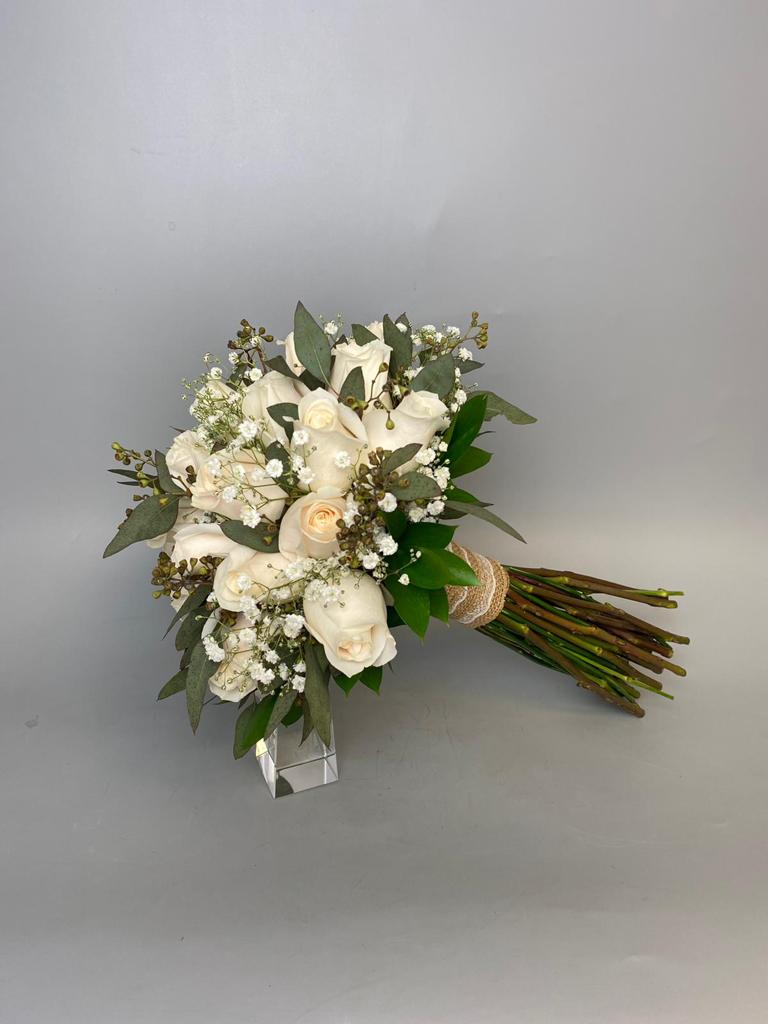 #571 Precioso bouquet de novia diseñado con 2 docenas de Rosa, Eucalipto Seeded, Gypsophila y Follaje de temporada con delicado trabajo de cinta de yute que aporta un aire muy romántico.