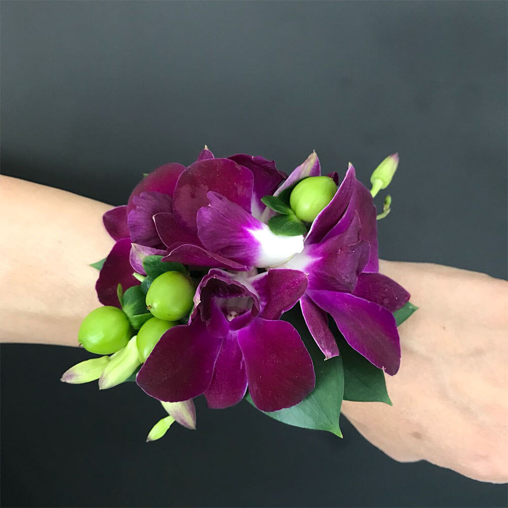 #550 Corsage con Orquídea Dendrobium con Hypericum y Ruscus.