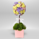 #204 Un pequeño universo de dulzura. Este encantador diseño combina peonías en tonos crema, rosa y fucsia con esferas de dianthus verde que aportan un toque fresco y divertido. Todo presentado en una delicada base blanca de cerámica texturizada.