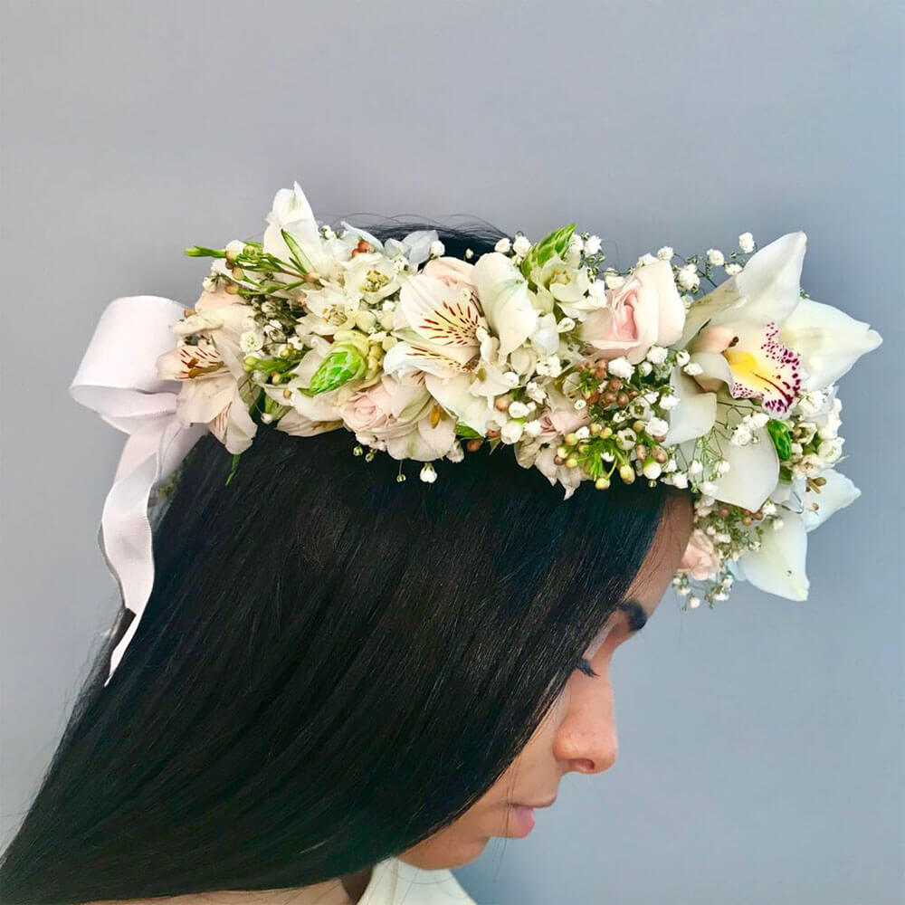 #542 Corona para novia con flores de orquídea cymbidium, alstroemeria, mini rosa, y baby’s breath y delicado lazo en la parte de atrás.