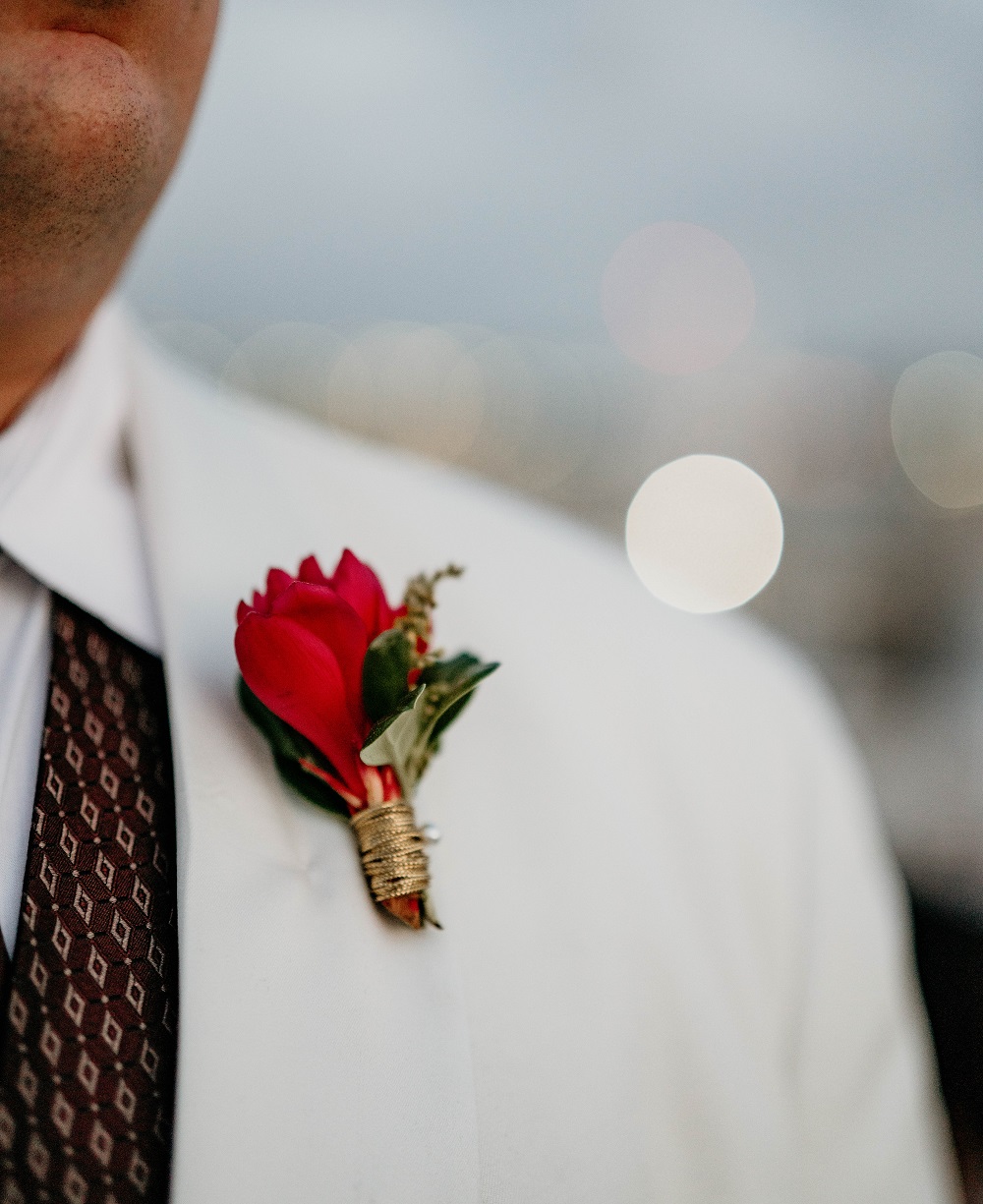 #581 Bouttoniere de novio elaborado a partir de pétalos de Ginger con hilo dorado.