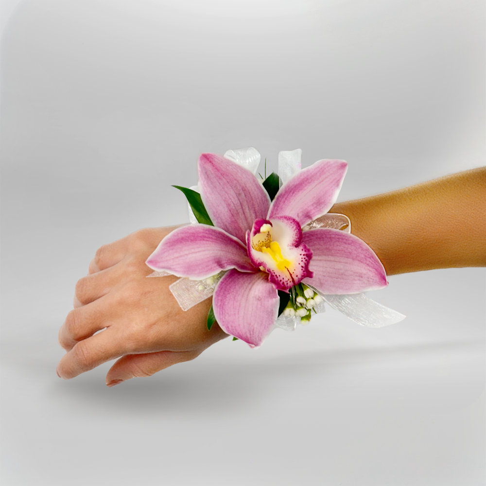 #563 Una delicada flor de Cymbidium en tono rosado protagoniza este corsage realzado con un listón traslúcido y detalles verdes. Un toque de elegancia atemporal para esa ocasión tan especial.