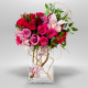 #221 Una explosión de color y estilo. Este arreglo forma parte de nuestra nueva colección y celebra la belleza de los contrastes vibrantes. Con rosas intensas, tulipanes, pincushion, hortensias, eryngium y follajes de temporada, cada flor aporta carácter y energía. Presentado en una base cerámica blanca de líneas limpias, es una pieza que transforma cualquier espacio con su fuerza y alegría.