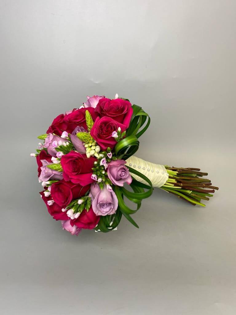 #580 Bouquet de novia estilo Victoriano preparado con 2 docenas de Rosas, Estrellas de Belen, Raffine, loops de Lily Grass y delicado trabajo de cinta alrededor de los tallos.