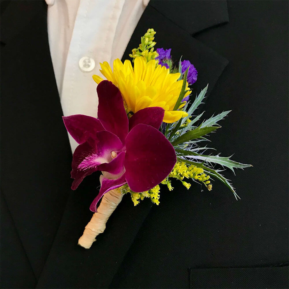 Boutonniere multicolor con mokara, margarita, statice, eringyum y toque de solidaster.
