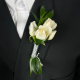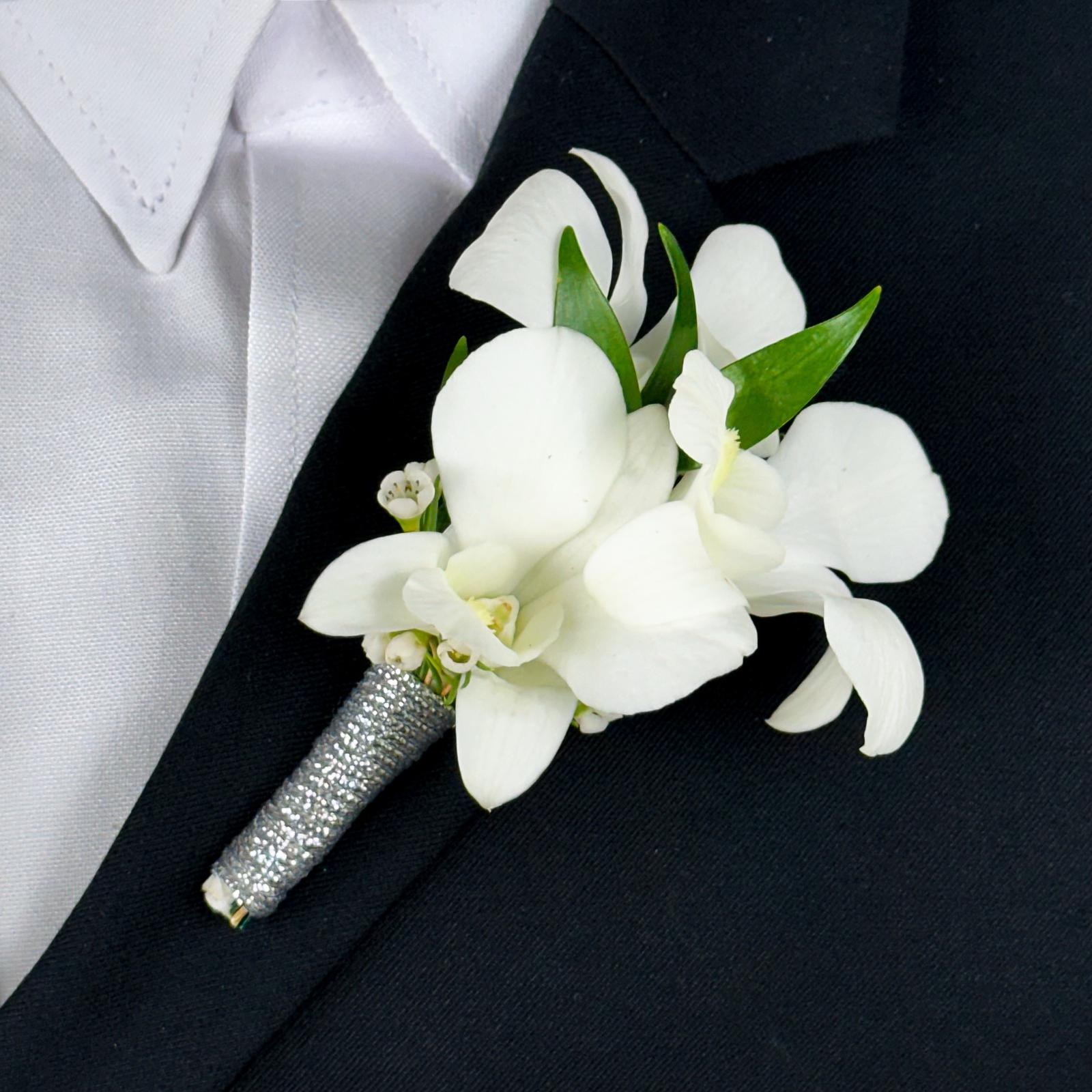 #567 Este elegante Boutonniere combina la pureza de la orquídea blanca con toques verdes y un sutil brillo en su base, creando el complemento perfecto para una ocasión especial.