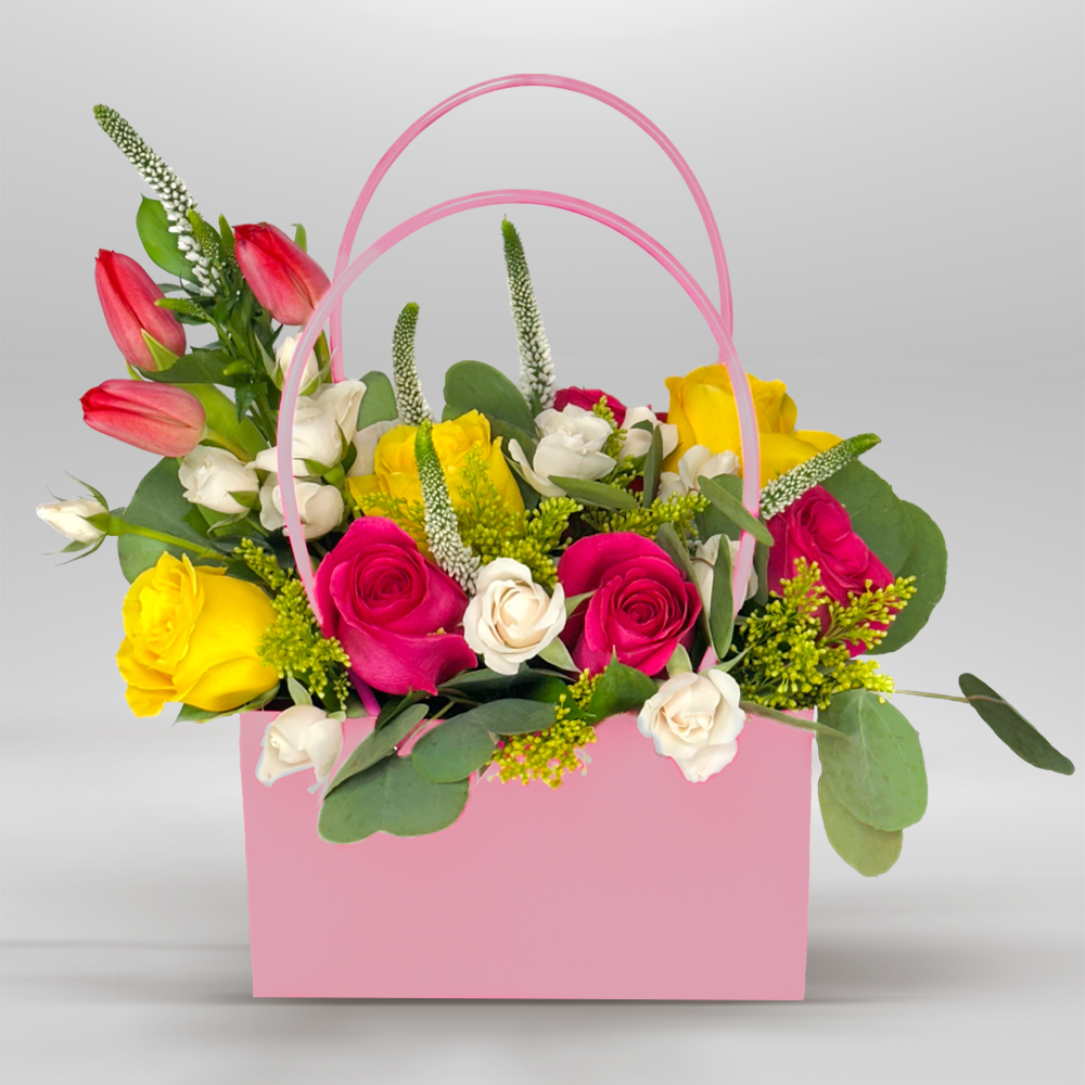 #236 Un diseño encantador que combina rosas, tulipanes, verónicas, mini rosa y follajes de temporada creando un arreglo fresco y colorido. La base fucsia le aporta un toque vibrante y versátil, ideal para cualquier ocasión.