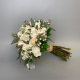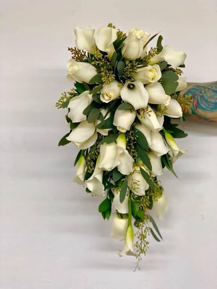 #572 Elegante bouquet de novia estilo cascada con 18 unidades de Rosa, Lirios mini Calla, Eucalipto Seeded y Follaje de temporada elaborado en porta bouquet.