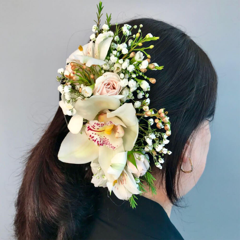 #546 Romántica diadema en tonos suaves preparada con flores de cymbidium, mini rosas y gypsophila.