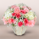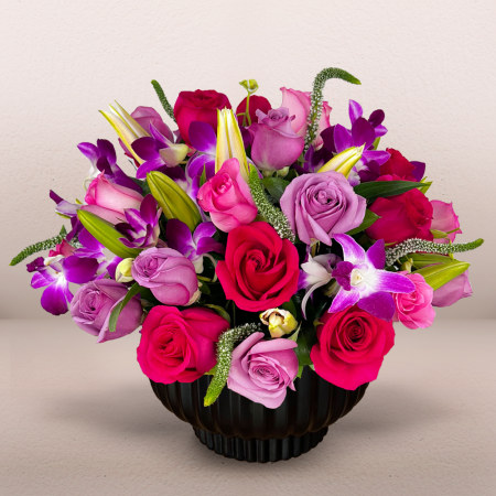 #655 Elegancia que florece con serenidad. Este diseño moderno combina orquídeas phalaenopsis y detalles de pussy willow con un hermoso jardín en rosas fucsias, wax flower presentado en una base blanca de cerámica que resalta la delicadeza de esta composición.