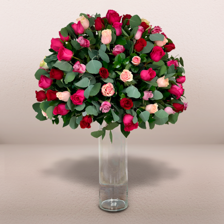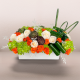 #659 Un arreglo que celebra la esencia vibrante de mamá con una mezcla de tonos cálidos y radiantes: amarillos, naranja, coral y fucsia. Presentado en una base blanca de diseño moderno.