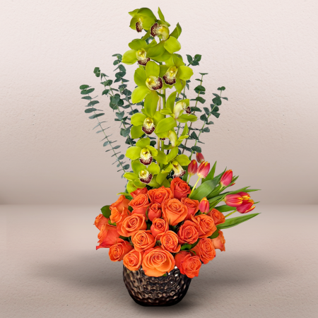 #654 Tonos suaves como solo el amor que Mamá sabe dar. Este arreglo combina rosas y claveles en tonos rosados, hortensias blancas y gypsophila presentadas en una hermosa base texturizada que resalta la elegancia y sutileza de esta composición.