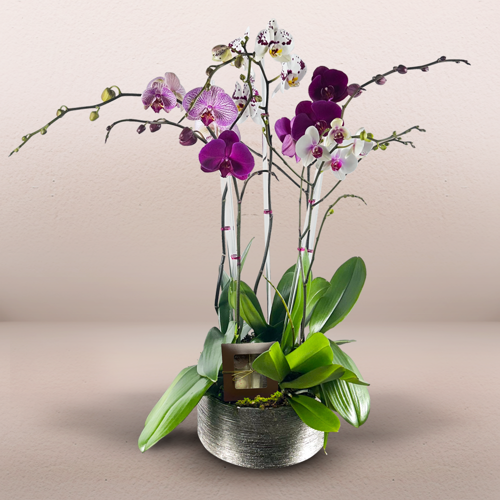 #658 Elegante diseño con varias plantas de orquídeas phalaenopsis en tonos blanco, fucsia y púrpura. Esta composición esta presentada en una base metálica silver y viene acompañada de una caja de chocolates. Un arreglo sofisticado que combina lujo y distinción con la belleza atemporal de las orquídeas.