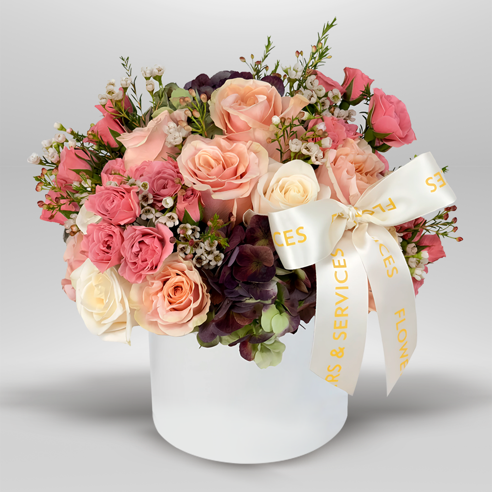 #226 Parte de nuestra nueva colección! Este diseño celebra la elegancia en su forma mas sutil. Con una armonía de rosas, mini rosas, hortensias y wax flower en tonos suaves, esta composición destaca por su delicadeza y refinamiento. Presentada en una base de cerámica con forma geométrica y un hermoso lazo con el sello que identifica nuestra marca.