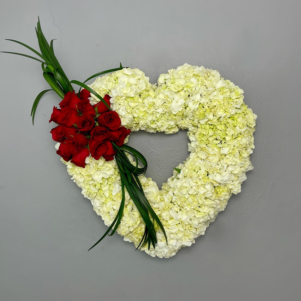 #424 Diseño en forma de Corazón preparado con Rosas y Hortensias.