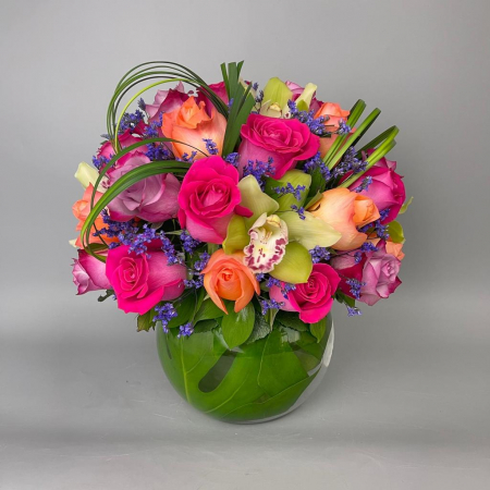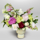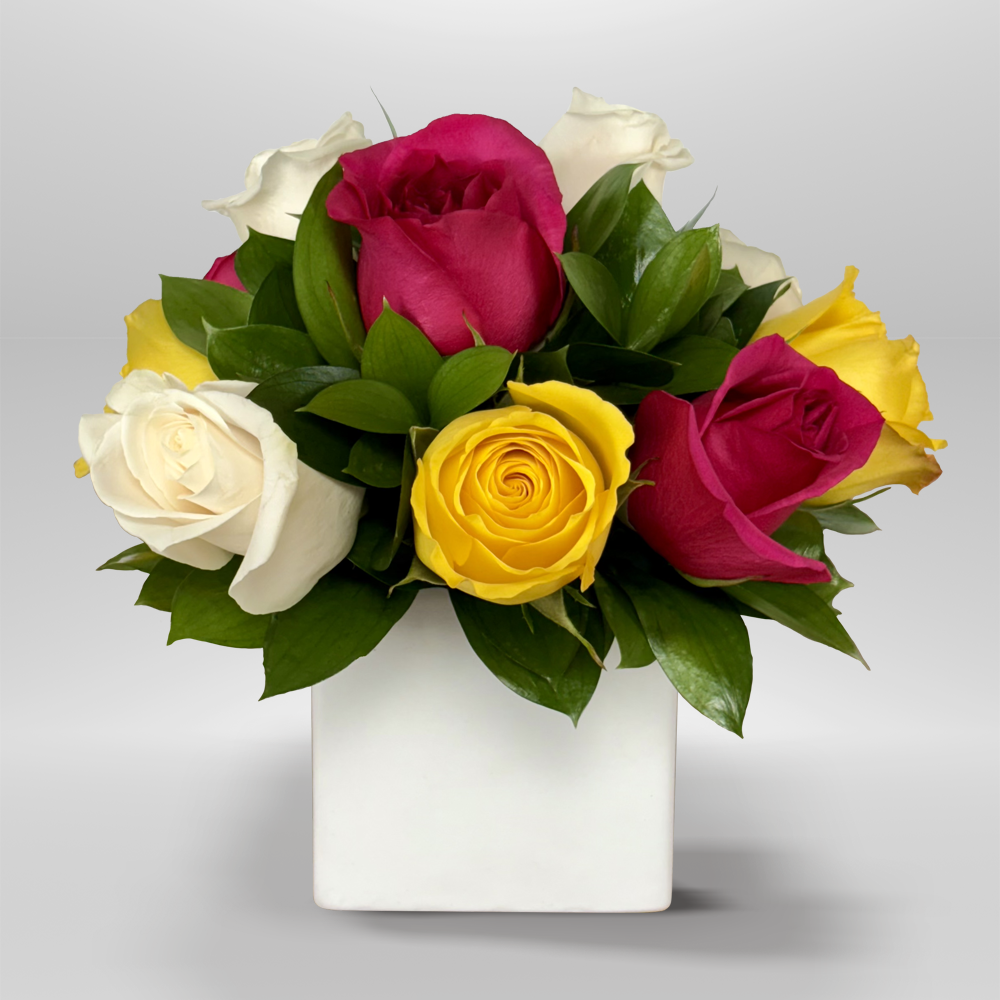 #227 Colorido, alegre y simplemente adorable. Este diseño con doce rosas y ruscus en base de cerámica blanca es perfecto para sorprender con ternura y estilo.
