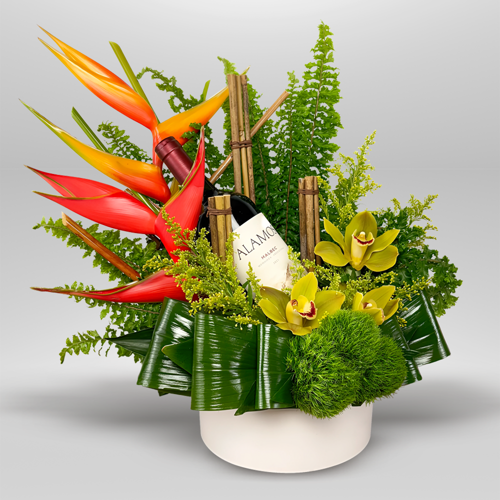 #684 Celebra el Día del Padre con este vibrante arreglo que combina la exótica presencia de las heliconias y las flores de cymbidium con exóticos follajes de temporada, acompañado de una botella de vino tinto Alamos. Presentado en una base de cerámica blanca, es un regalo único que fusiona el arte floral con el sabor del buen vino.