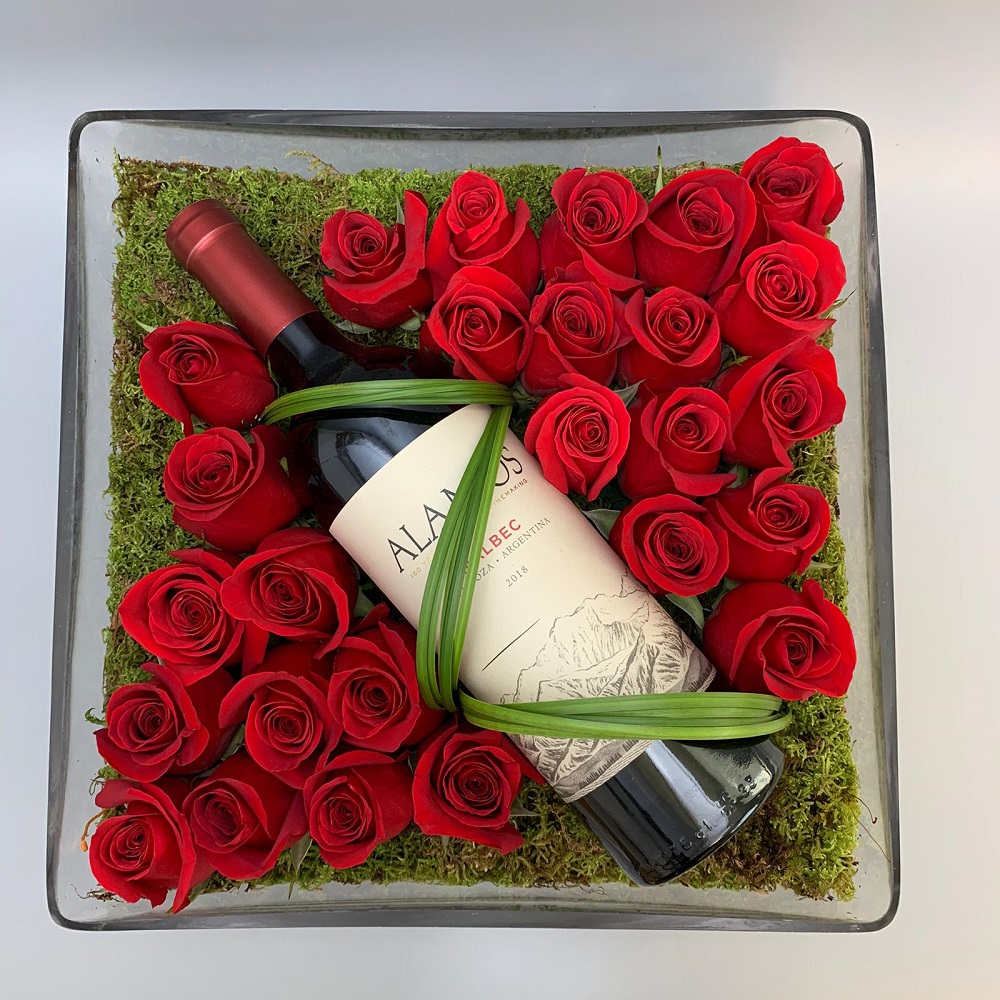 #99 Jardín elaborado con 2 docenas de Rosas sobre una base de musgo con botella de vino en moderna base de cristal.