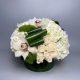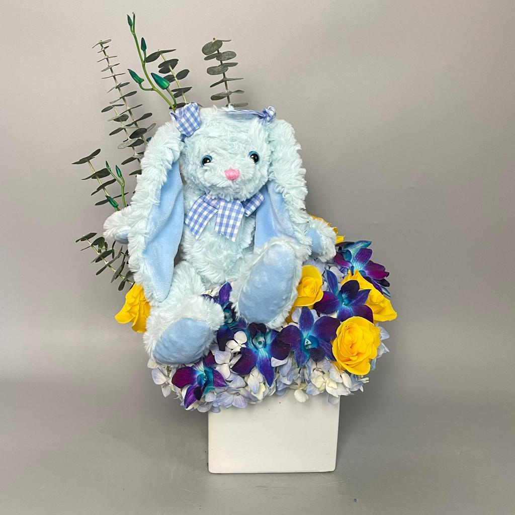 #59 Hermoso y tierno diseño elaborado con seis unidades de Rosa, Hortensia, Dendrobium, y Eucalipto baby , peluche de conejo disponible solo en rosado, en base de cerámica.